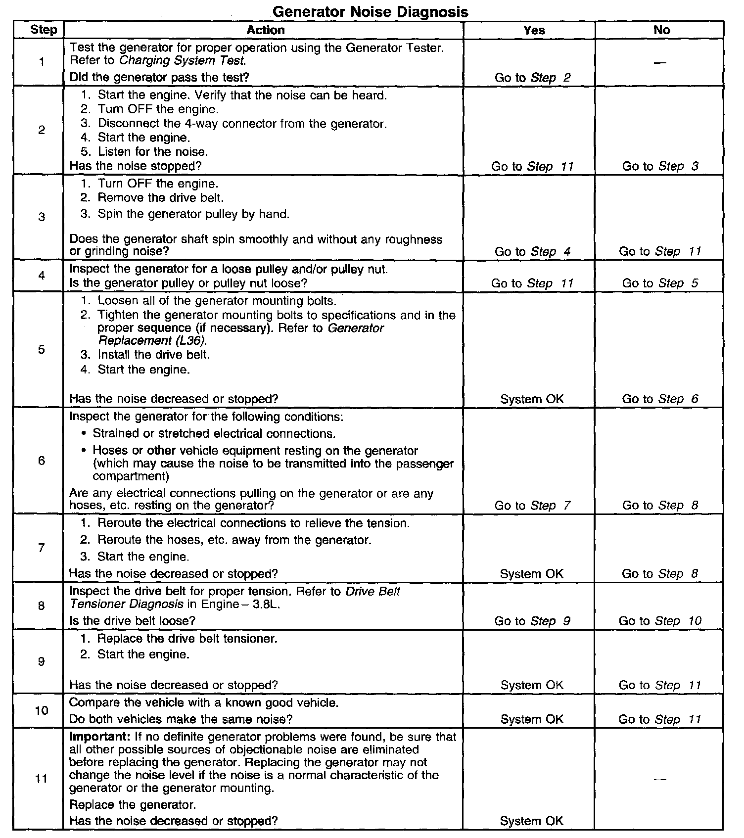 Noise from a generator may be due to electrical or mechanical noise. Electrical noise (magnetic whine) usually varies with the electrical load placed on the generator and is a normal operating characteristic of all generators. When diagnosing a noisy generator, it is important to remember that loose or misaligned components around the generator may transmit the noise into the passenger compartment and that replacing the generator may not solve the problem.