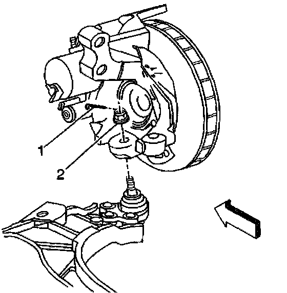 Tighten the lower ball joint nut (2) to 10 Nm (88 inch lbs.) plus an additional 180 degrees - 300 degrees (3 - 5 flats).