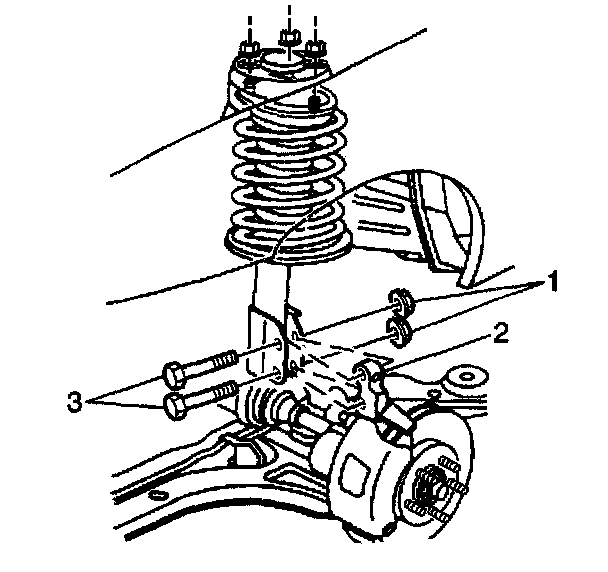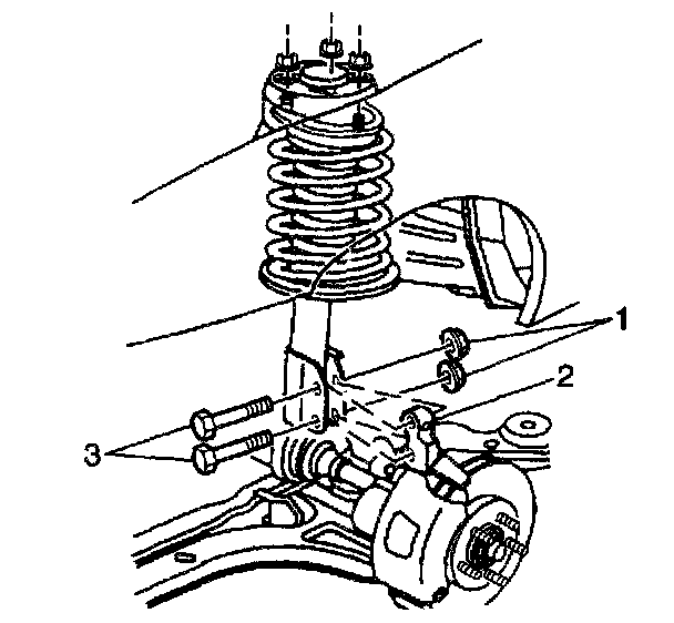 8. Remove the front strut to steering knuckle retaining bolts (3) and nuts (1).