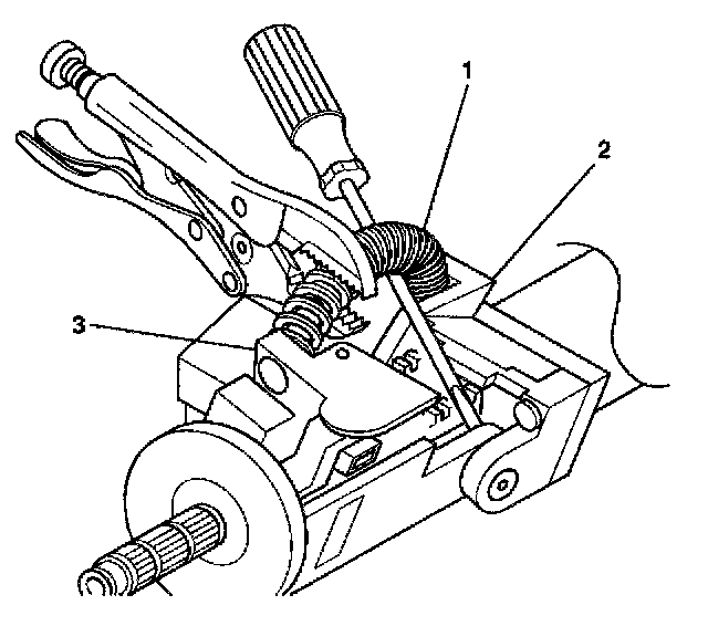 3.2. Secure the tilt spring and continue prying until the tilt spring disengages from the post on the steering column support assembly (2) and the steering column tilt head assembly (3).