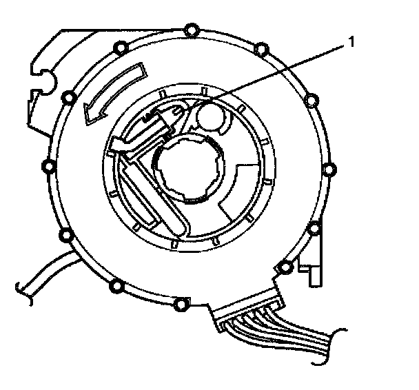 2. A new inflatable restraint steering wheel module coil will be precentered. Do not remove the orange tab until installation is complete. Do not depress the tab (1) on the back of the inflatable restraint steering wheel module coil.