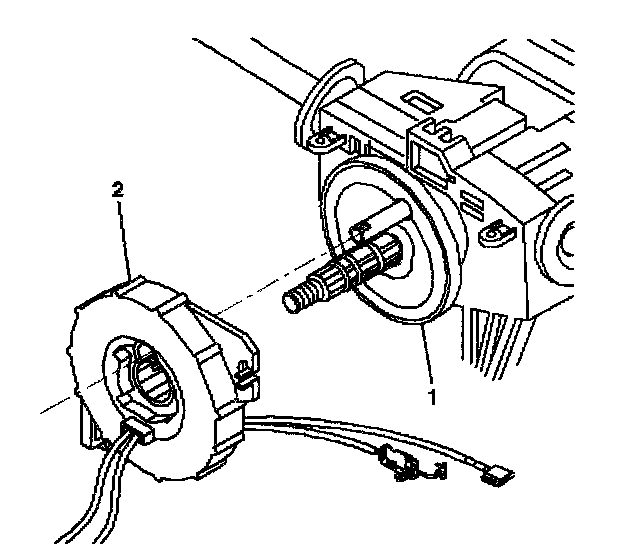 4. Align the inflatable restraint steering wheel module coil (2) with the horn tower sticking through the shaft lock shield assembly (1).