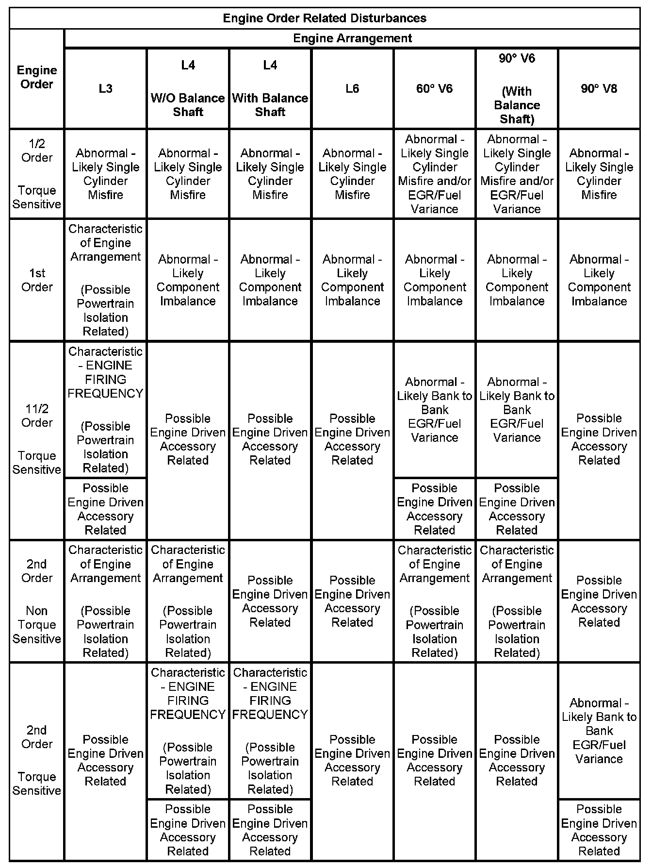3. If the dominant frequency (Hz) recorded during duplication of the disturbance and the engine firing frequency (Hz) just calculated ARE related, then an engine FIRING FREQUENCY related disturbance is present. (Engine firing frequency disturbances are usually related to improper isolation of a component.) Refer to the Engine Order Related Disturbances table.