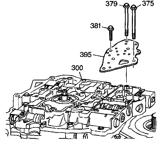 3. Remove the control valve body bolts (375, 379 and 381) that mount the fluid pressure manual valve position switch to the control valve body (300)