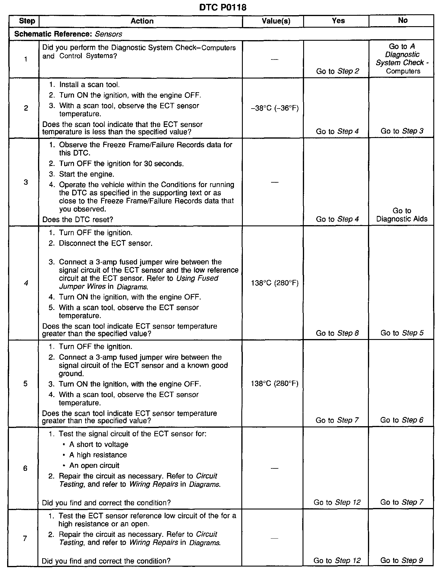 Use the Temperature vs Resistance Table in order to test the ECT sensor at various temperature levels in order to evaluate the possibility of a skewed sensor. A skewed sensor could result in poor driveability concerns. Refer to Temperature vs Resistance.