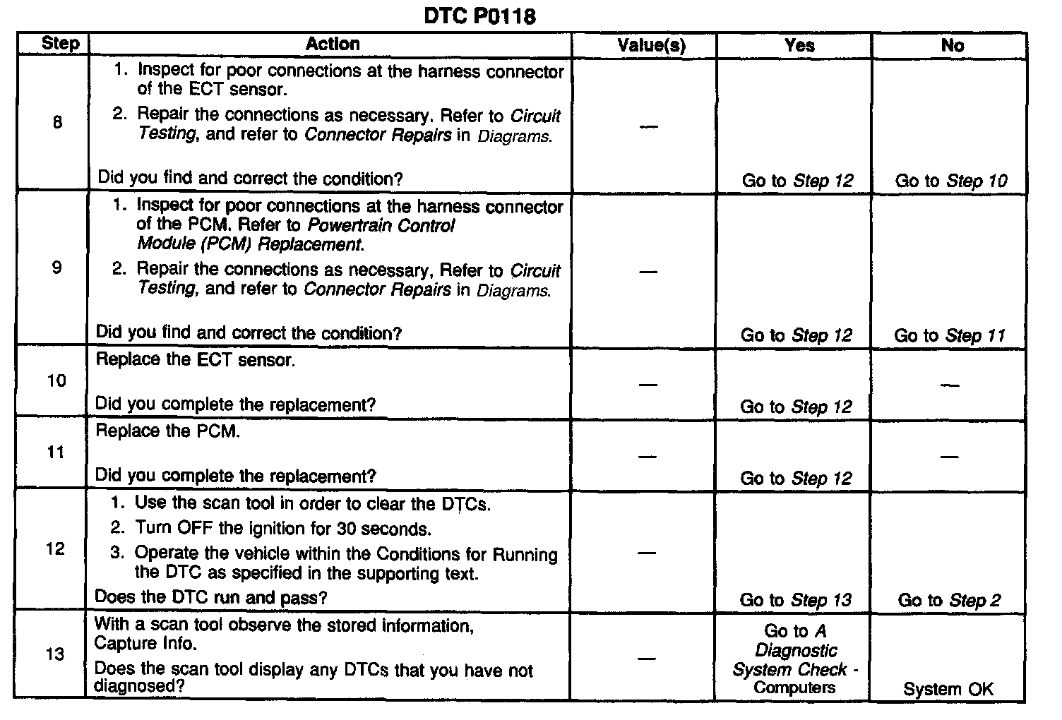 The numbers below refer to the step numbers on the diagnostic table.