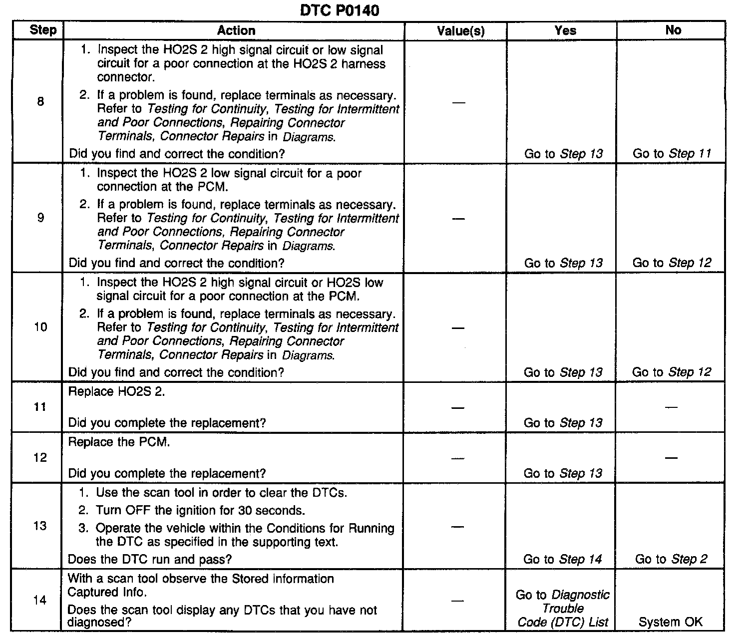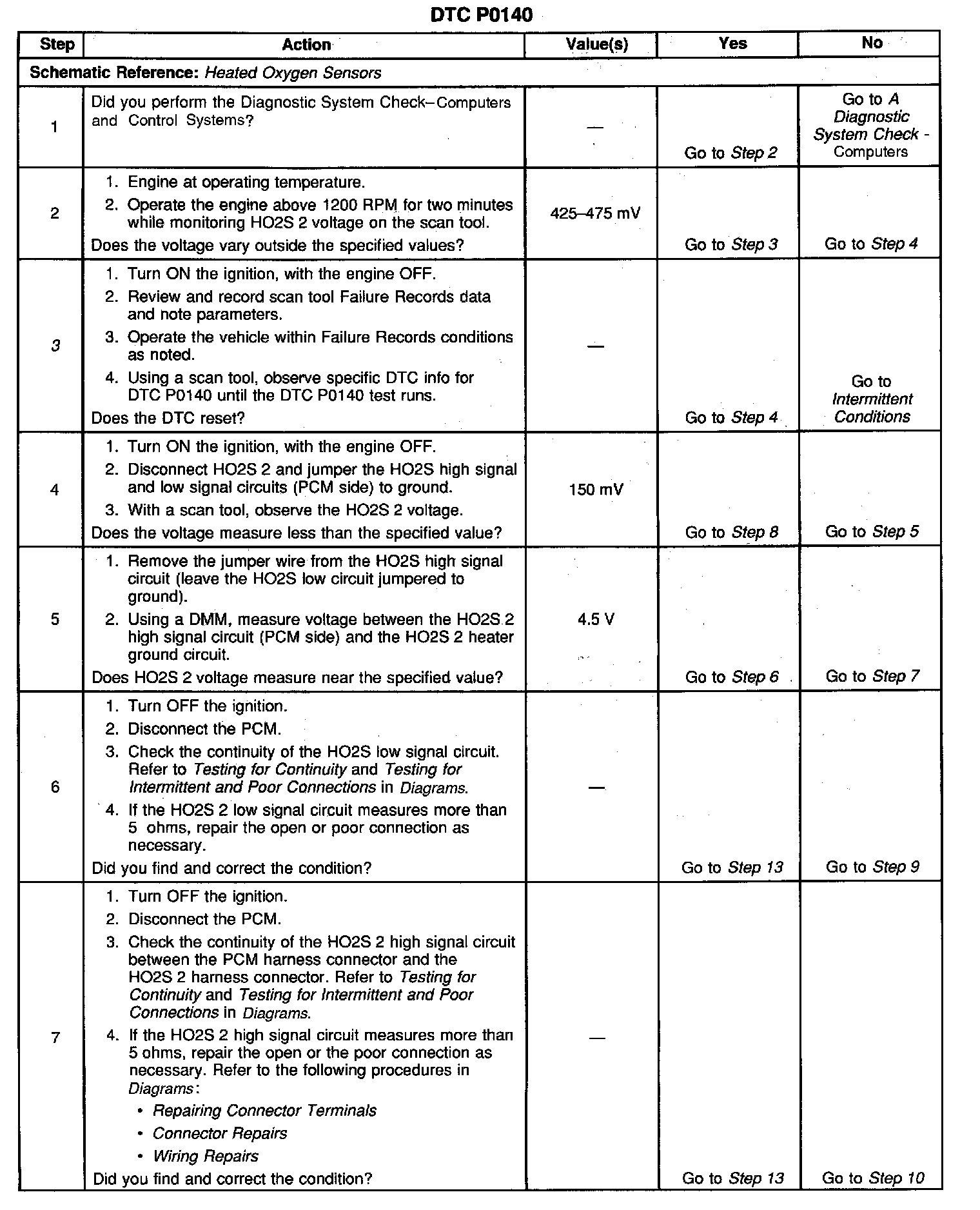 CIRCUIT DESCRIPTIONThe Powertrain Control Module (PCM) supplies a bias voltage of about 450 mV between the Heated Oxygen Sensor (HO2S) high signal and low signal circuits. When measured with a 10-megohm digital multimeter, this may display as low as 320 mV. The oxygen sensor varies the voltage within a range of about 1000 mV when the exhaust is rich, down through about 10 mV when exhaust is lean. The PCM constantly monitors the HO2S signal during closed loop operation and compensates for a rich or lean condition by decreasing or increasing injector pulse width as necessary. If the HO2S 2 voltage remains at or near the 450 mV bias for an extended period of time, DTC P0140 will be set, indicating an open HO2S high signal or HO2S low signal circuit.