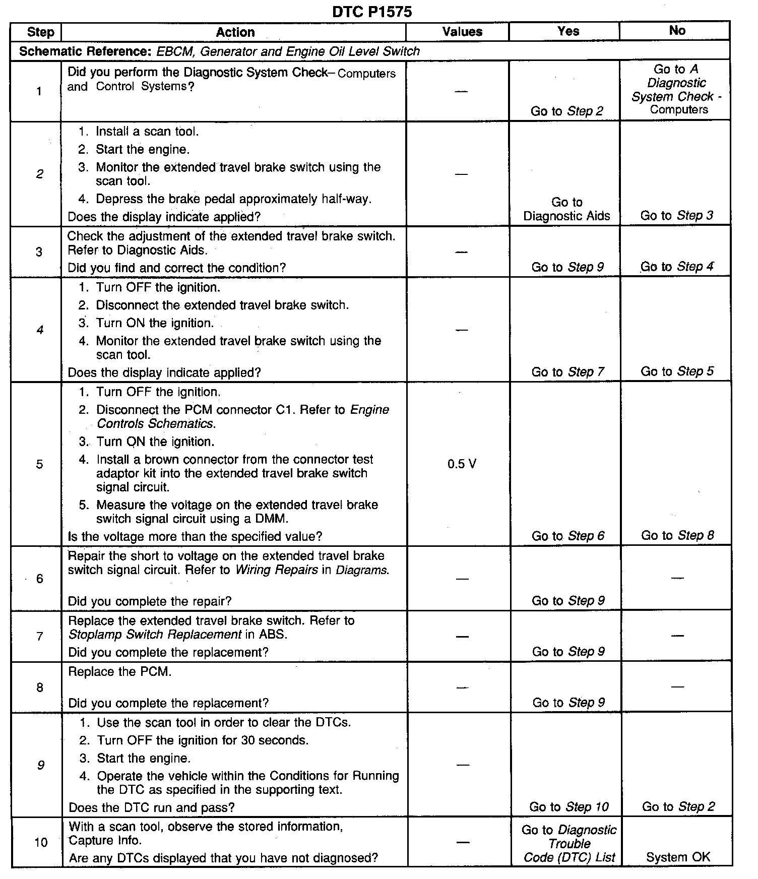 If the PCM senses low voltage on the extended travel brake switch signal circuit when the extended travel brake switch should be open, DTC P1575 will set.