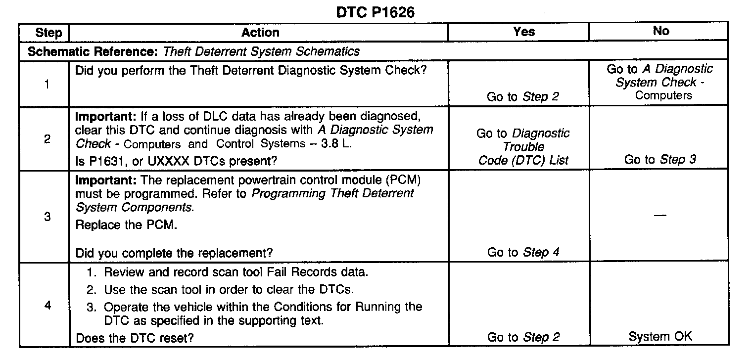 CIRCUIT DESCRIPTIONThe theft deterrent controller (VTD) module produces the theft deterrent fuel enable signal when ignition is ON and the proper transponder key value is detected. The powertrain control module (PCM) monitors the fuel enable signal during crank. If the proper signal is present on the Class 2 Serial Data Circuit, the PCM enables the fuel delivery in order to allow the engine to start. If the PCM determines that the fuel enable signal is not present or incorrect while the engine is running, DTC P1626 is set. The engine continues to start and run as long as DTC P1626 is stored. If the problem affects inputs to the VTD signal, the starter motor may be disabled. Refer to Vehicle Theft Deterrent (VTD) Description and Operation.