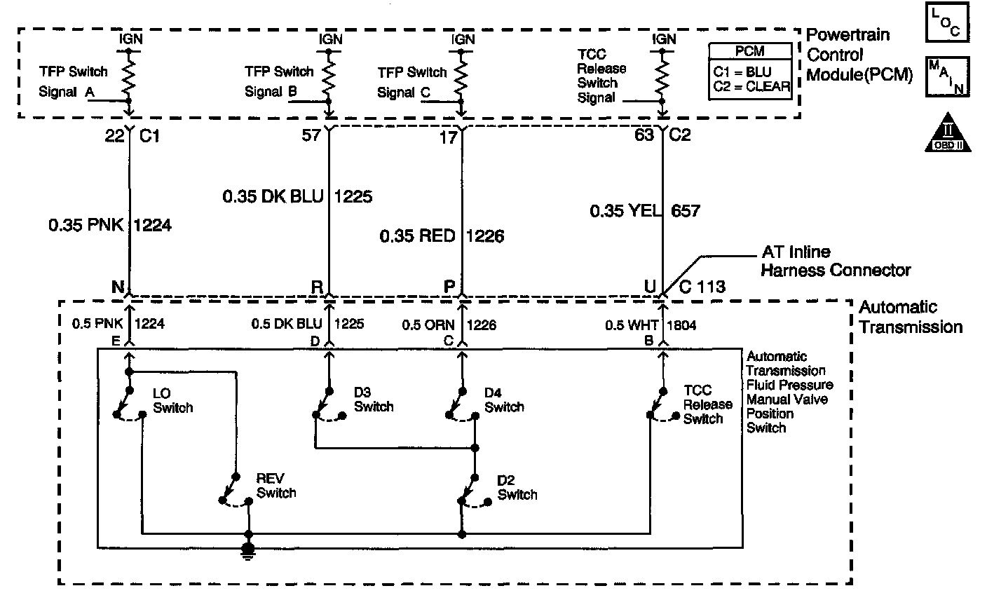 - TFP manual valve position switch indicates REVERSE, D2 or D4 for 7 seconds at engine start up without indicating PARK or NEUTRAL.