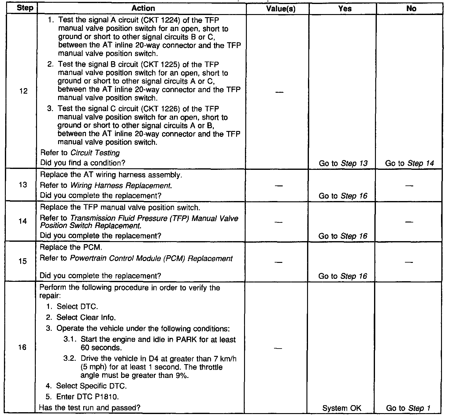If the PCM detects an invalid combination of inputs (LOW/HI/LOW or LOW/LOW/LOW), then DTC P1810 sets. If the PCM detects a gear range other than the one indicated, then DTC P1 810 sets. DTC P1 810 is a type B DTC.