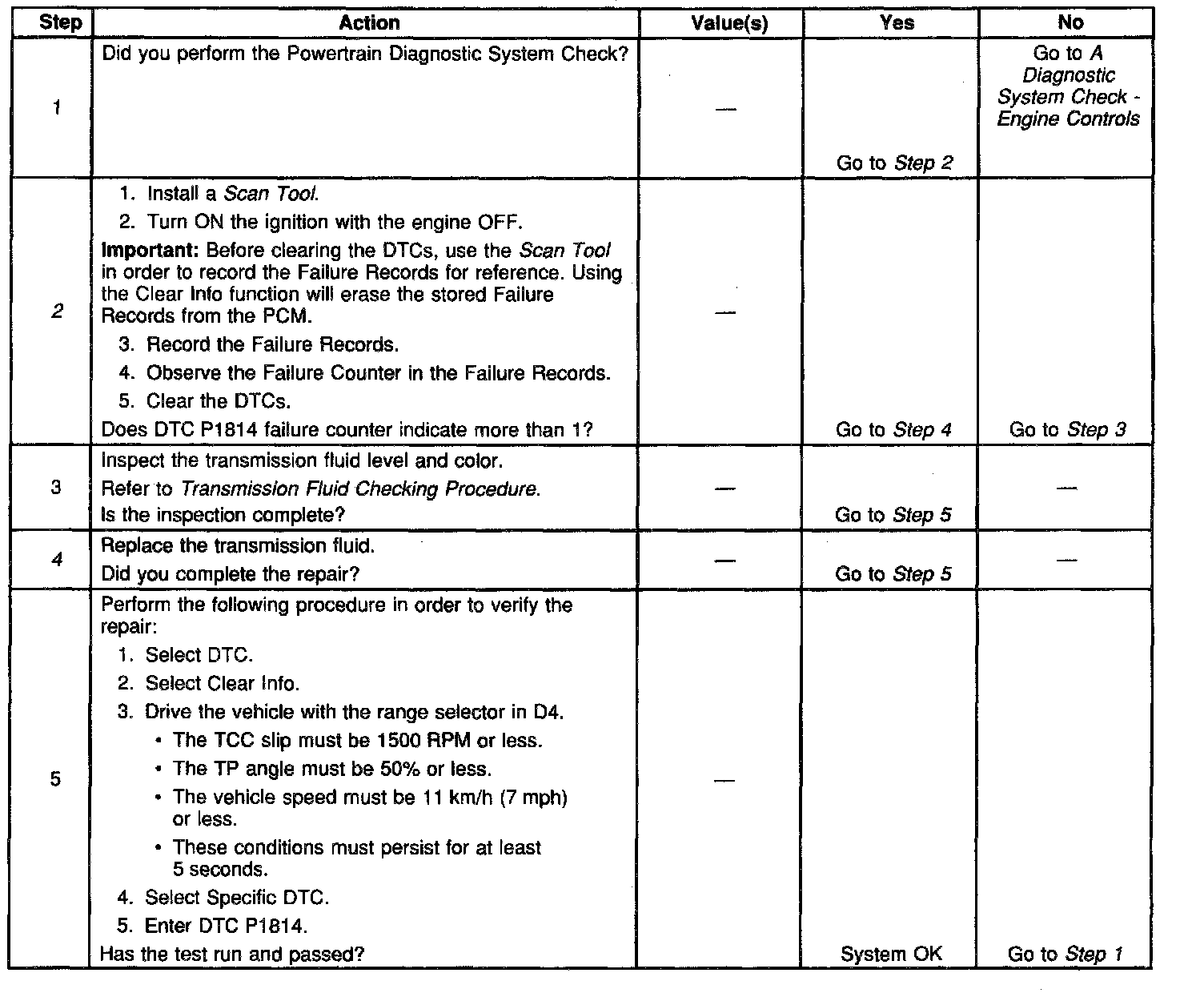 4. This step replaces the fluid and the filter. If DTC P1814 occurs more than once in the Failure Records, severe TCC damage may have occurred.