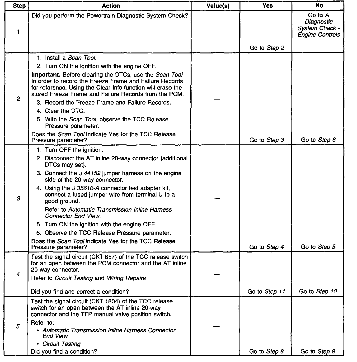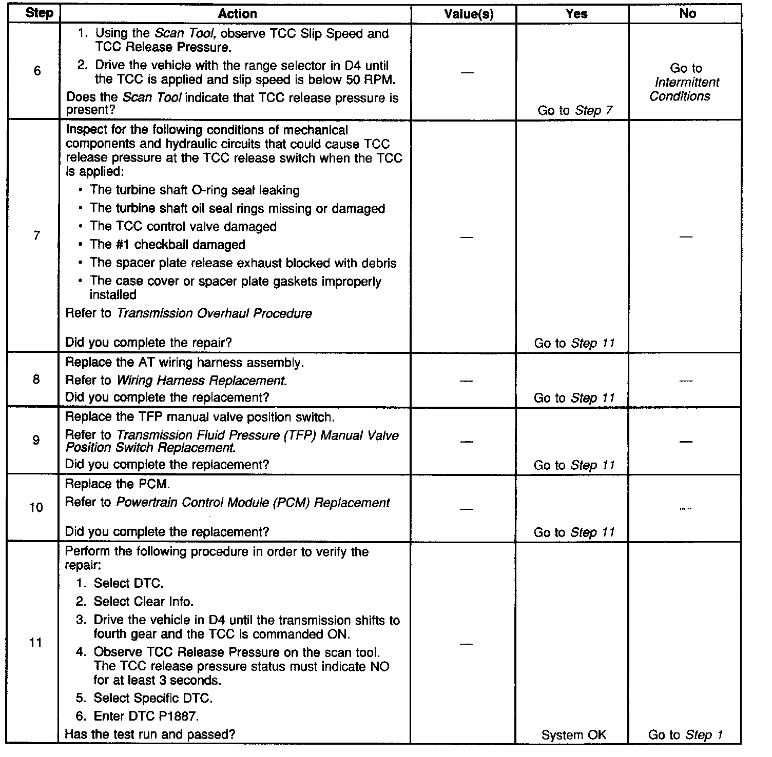 If the PCM determines that the TCC release switch is open (indicating that the TCC is not applied) and the TCC slip speed indicates that the TCC is applied, then DTC P 1887 sets. DTC P 1887 is a type B DTC.