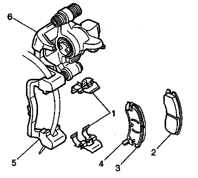 7. Install the brake pad retainers (1) into the brake caliper bracket (5).
