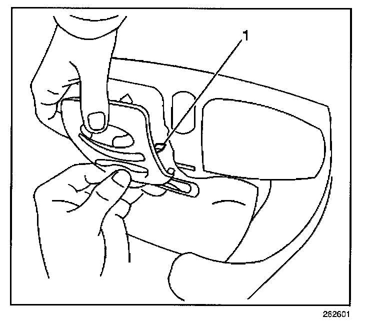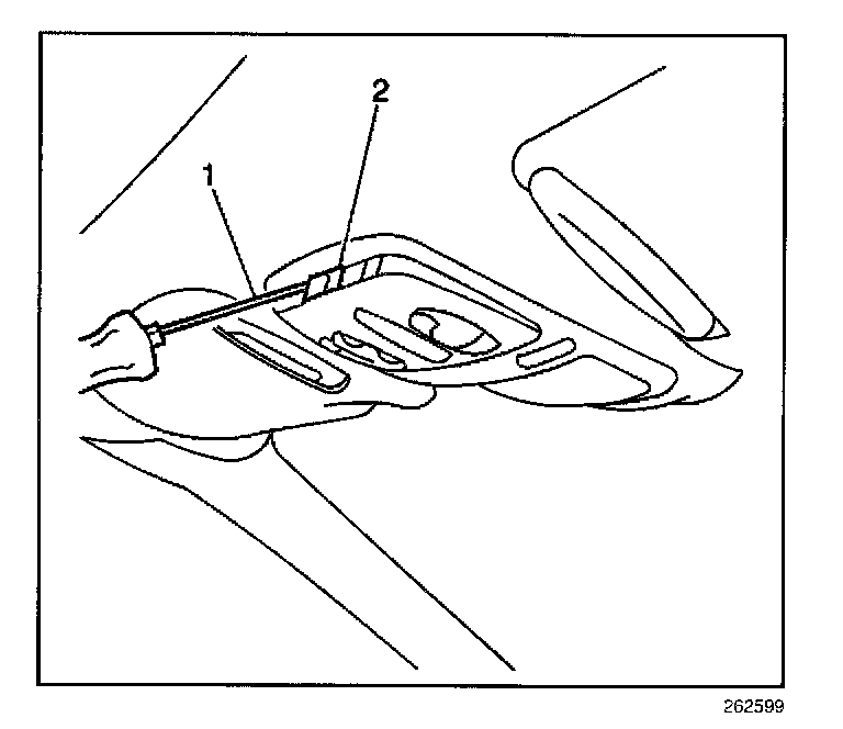 1. Insert a flat-bladed tool (1) at the rear edge of the access door in order to disengage the lock tab (2).