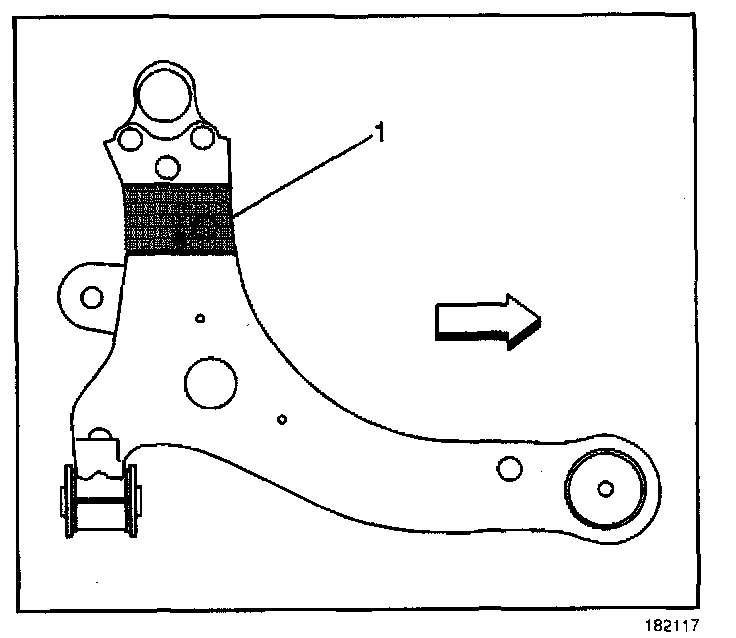When lifting the vehicle with a suspension-contact lift, place the front post lift points at the lower control arms (1).