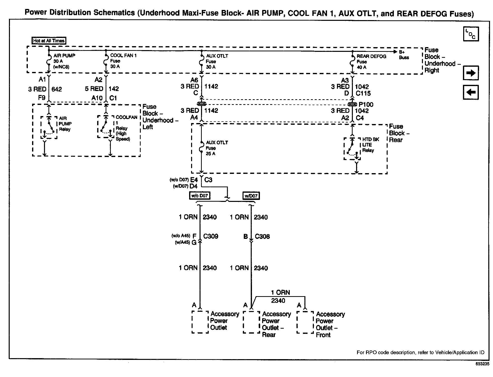 Power Distribution Schematics: Underhood Maxi-Fuse Block- AIR PUMP, COOL FAN 1, AUX OTLT, And REAR DEFOG Fuses: