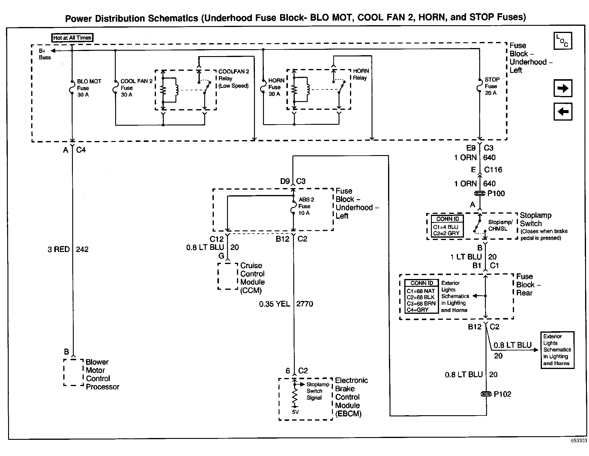 Power Distribution Schematics: Underhood Fuse Block- BLO MOT, COOL FAN 2, HORN, And STOP Fuses: