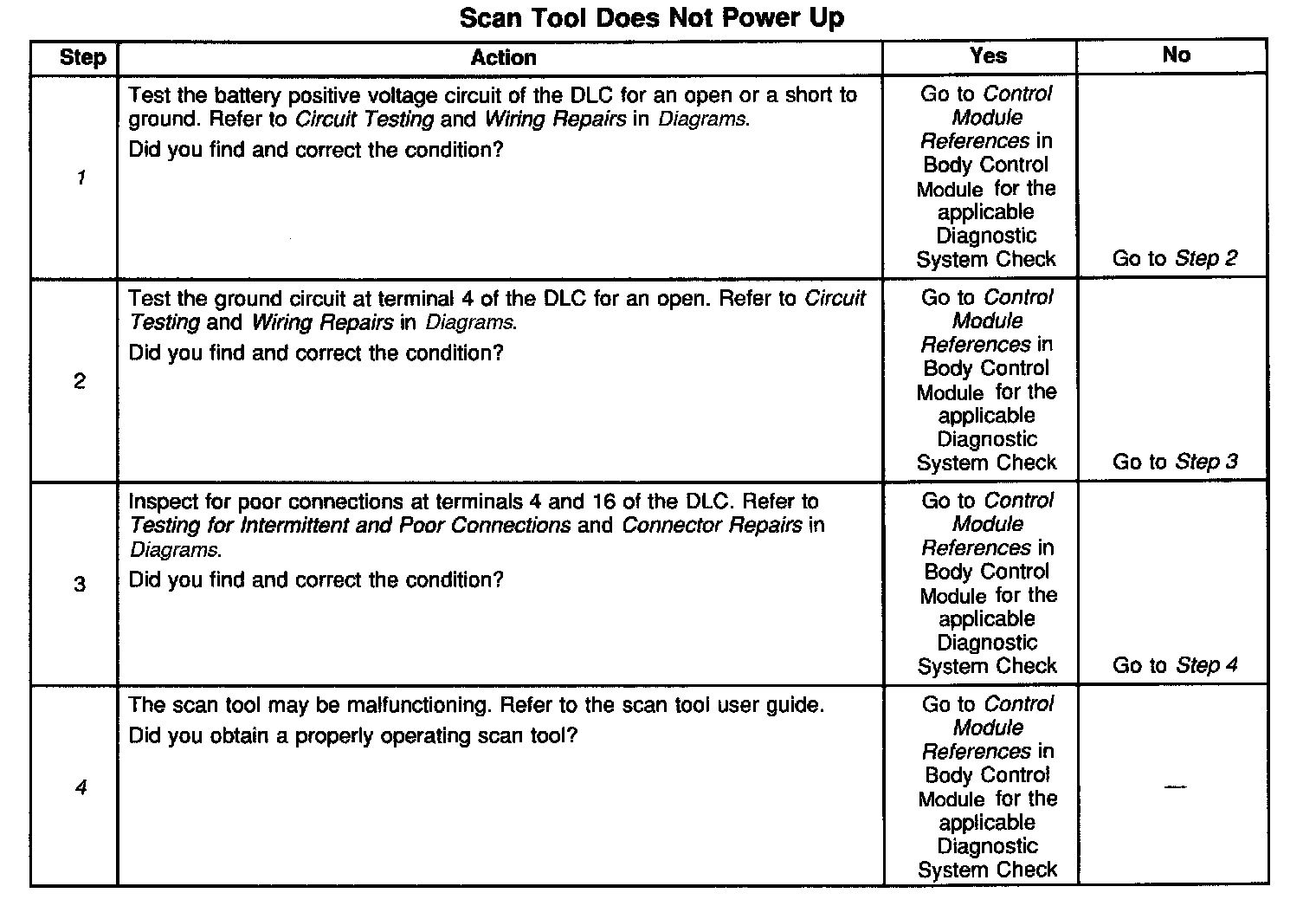 CIRCUIT DESCRIPTIONThe Data Link Connector (DLC) provides operating power for the scan tool at terminal 16 (battery positive voltage) and at terminal 4 (ground). The DLC provides the class 2 serial data signal at terminal 2 and signal ground at terminal 5. The scan tool will power up with the ignition off. Many modules, however, will not communicate unless the body control module (BCM) detects that the ignition is on and sends the appropriate power mode message.