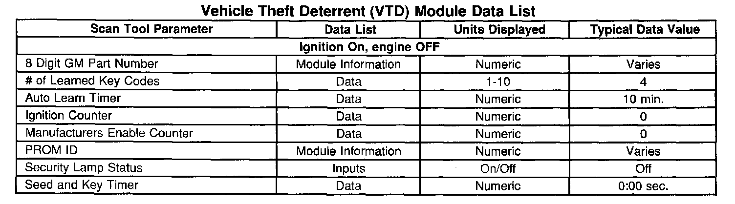 Vehicle Theft Deterrent (VTD) Module Data List