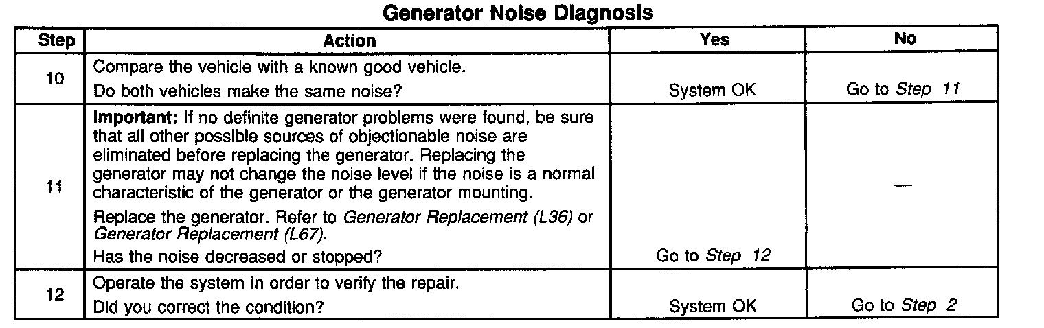 DIAGNOSTIC AIDSNoise from a generator may be due to electrical or mechanical noise. Electrical noise (magnetic whine) usually varies with the electrical load placed on the generator and is a normal operating characteristic of all generators. When diagnosing a noisy generator, it is important to remember that loose or misaligned components around the generator may transmit the noise into the passenger compartment and that replacing the generator may not solve the problem.