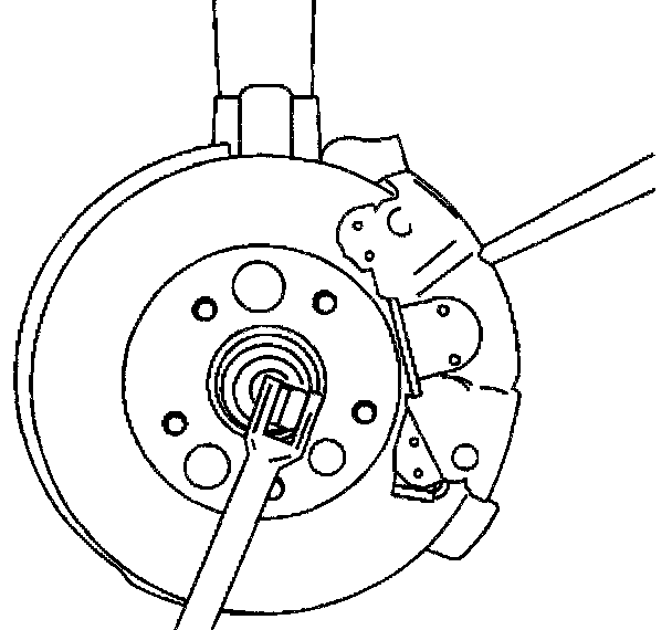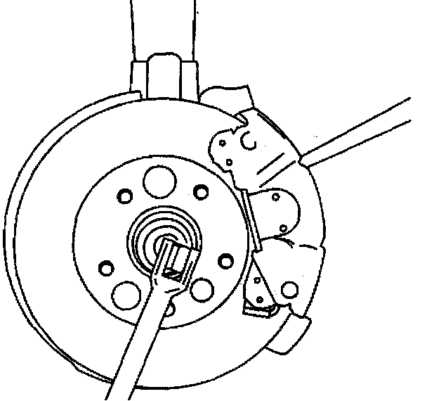 10. Install the drive axle nut by inserting drift or screwdriver into the caliper and rotor in order to prevent rotor from turning.