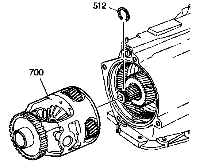 1. Install the drive axle retaining ring (509) and the output shaft differential inboard snap ring (512) onto the output shaft (510).