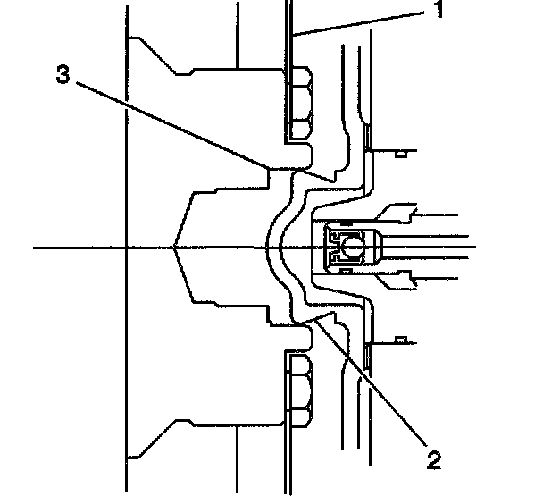 3. Align the torque converter hub (2) in the engine crankshaft (3) and install the torque converter to flywheel bolts.