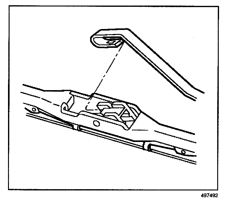 REMOVAL PROCEDURE1. Push in the button of the wiper blade clip and remove the wiper blade from the inside radius of the wiper arm.