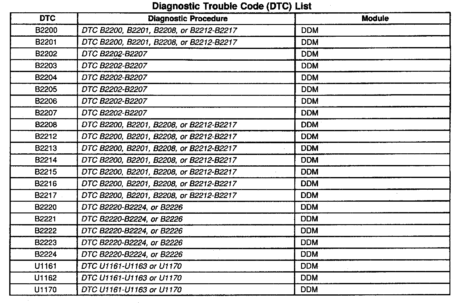 Diagnostic Trouble Code (DTC) List: