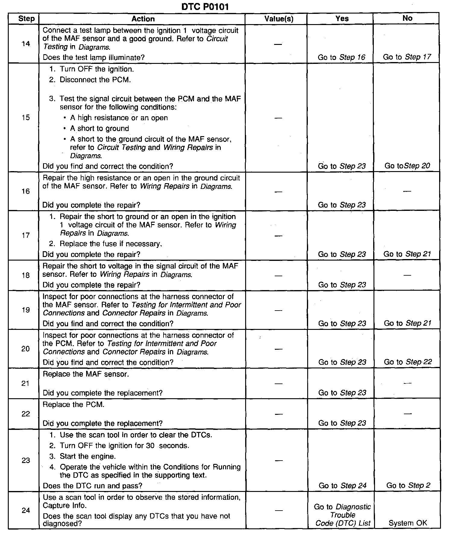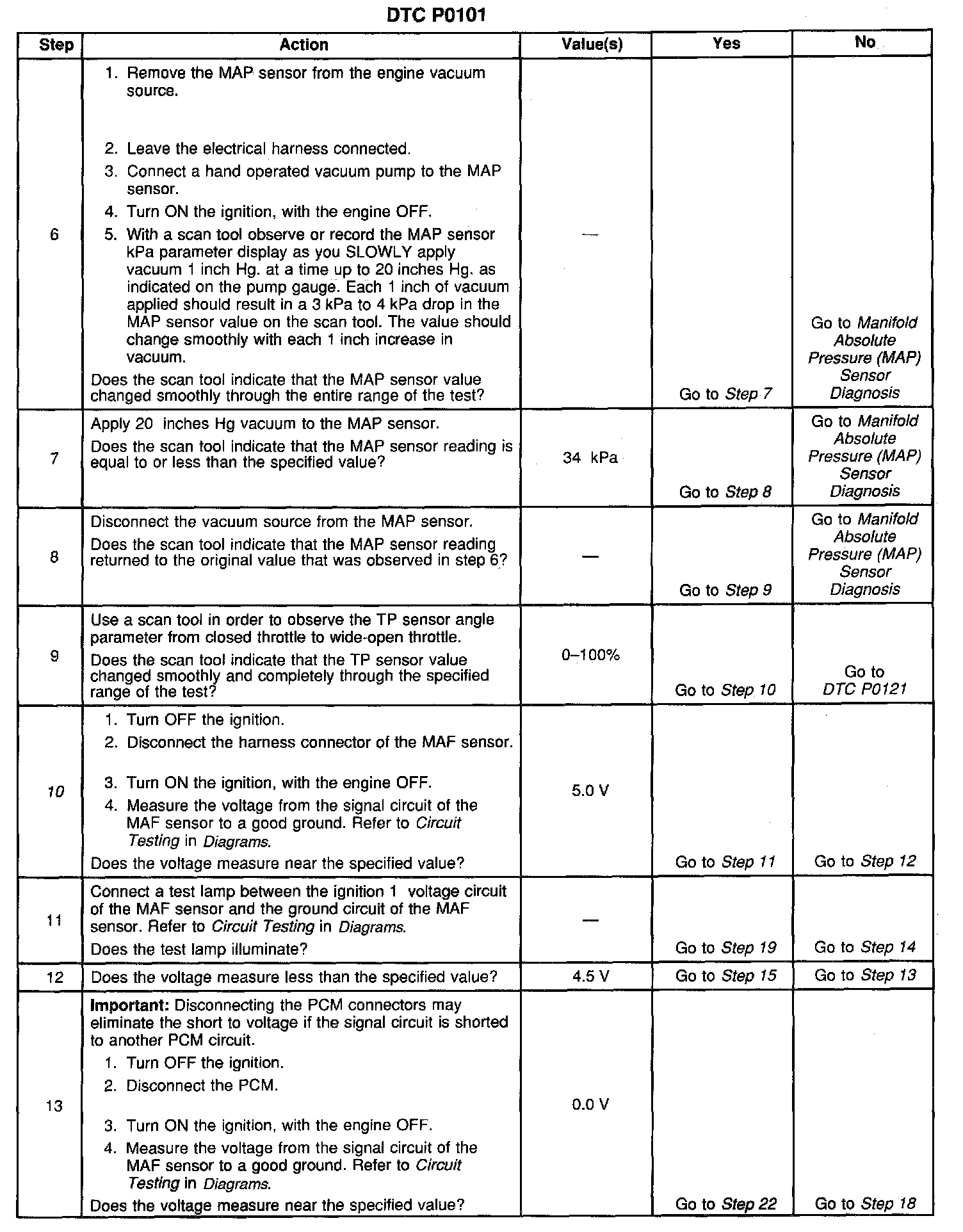 2. Diagnose any MAF, MAP, TP or System voltage DTCs before using this table. If a misfire condition exists or a rough running condition is observed with or without DTC P0300 proceed to DTC P0300 first.