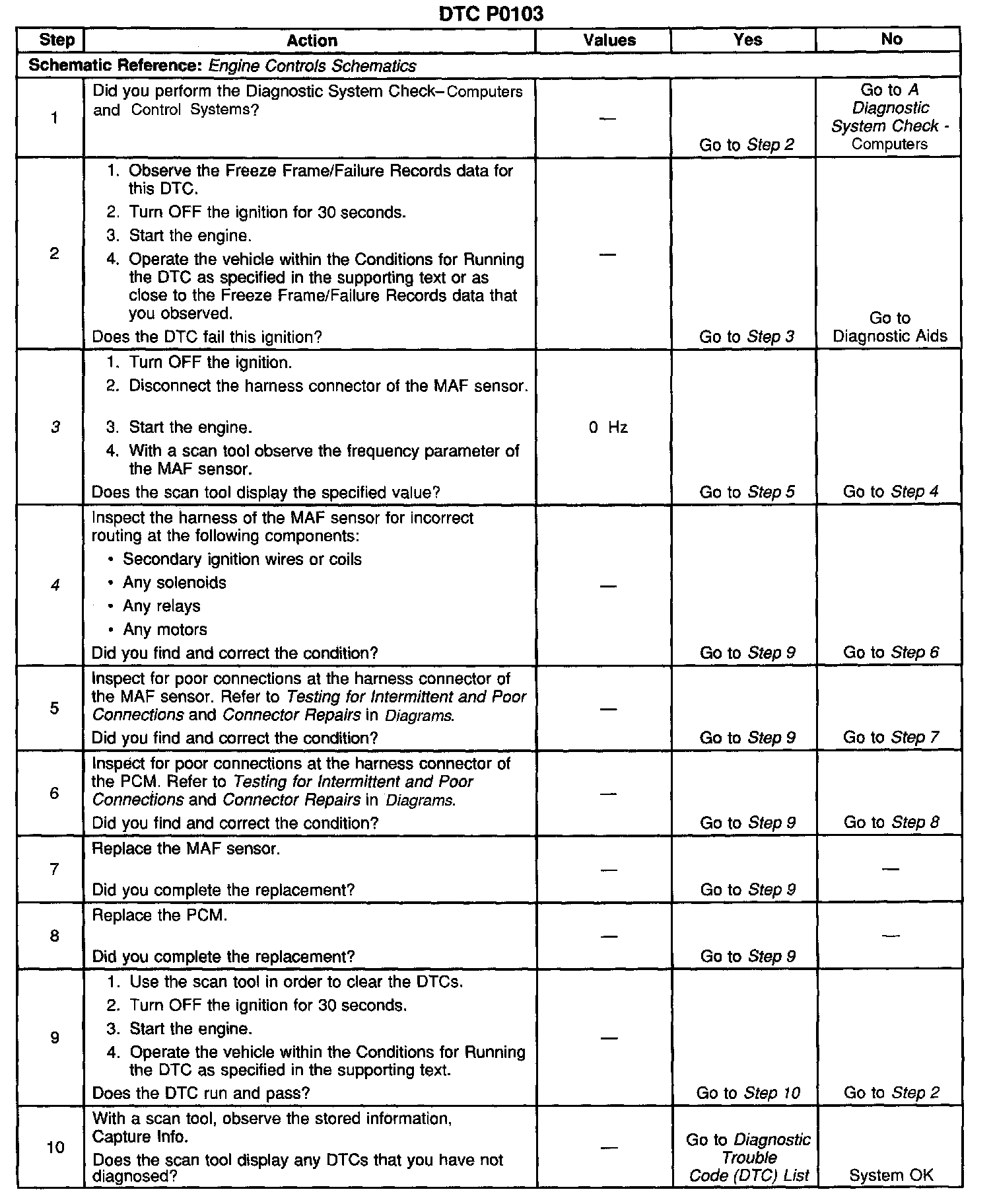 CIRCUIT DESCRIPTIONThe Mass Air Flow (MAF) sensor is an air flow meter that measures the amount of air entering the engine. The Powertrain Control Module (PCM) uses the MAF sensor frequency signal in order to provide the correct fuel delivery for a wide range of engine speeds and loads. A small quantity of air entering the engine indicates deceleration or idle. A large quantity of air entering the engine indicates an acceleration or high load situation. The MAF sensor has an ignition 1 voltage circuit, a ground circuit and a signal circuit. The PCM applies a voltage to the sensor on the signal circuit. The sensor uses the voltage in order to produce a frequency based on inlet air flow through the sensor bore. The frequency will vary within a range of around 2,000 Hertz at idle to about 10,000 Hertz at maximum engine load. DTC P0103 will set if the PCM detects a frequency signal higher than the possible range of a normally operating sensor.