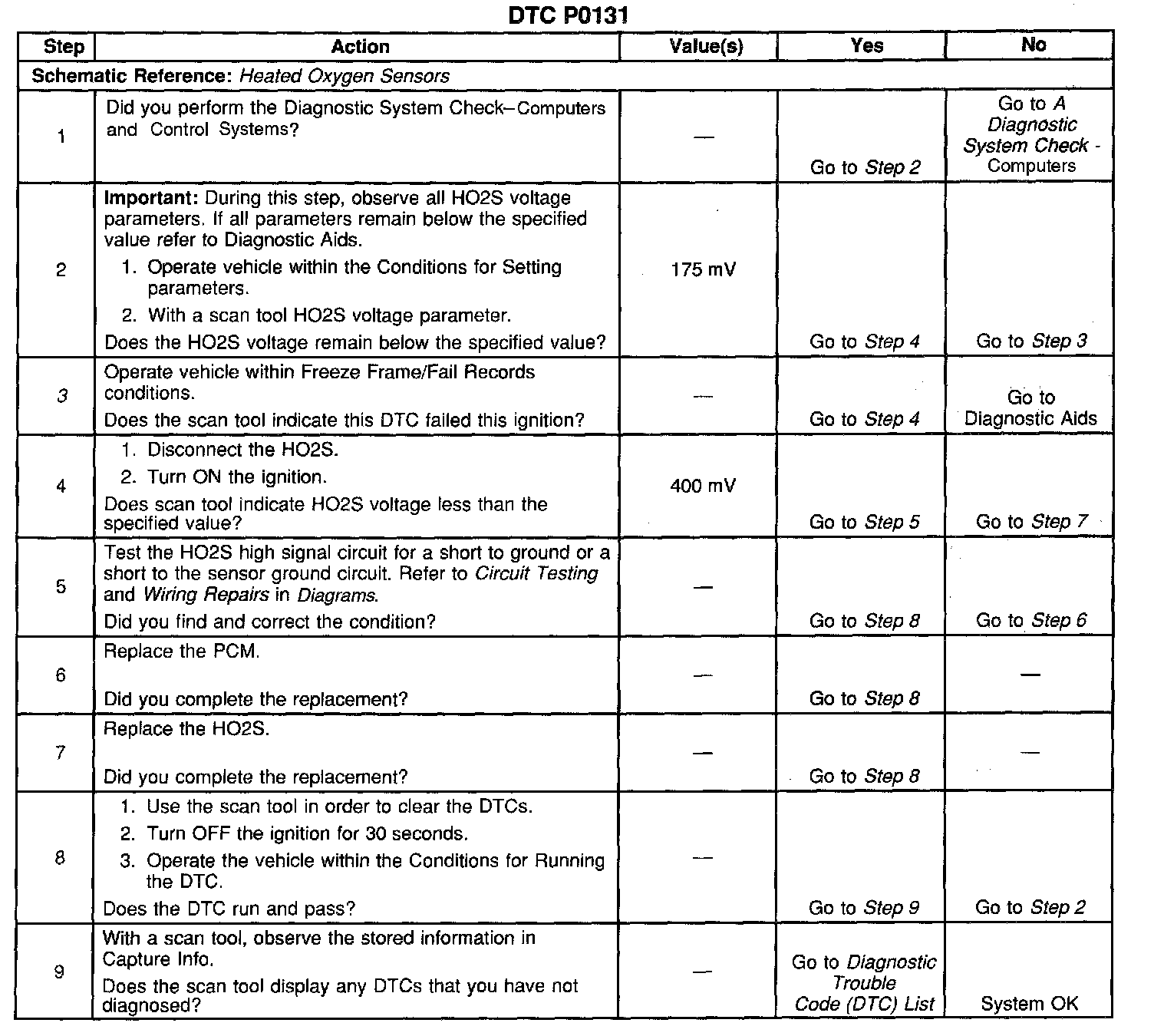 CIRCUIT DESCRIPTIONThe Powertrain Control Module (PCM) supplies a bias voltage of about 450 mV between the Heated Oxygen Sensor (HO2S) high and low signal circuits. When measured with a 10 megaohm Digital Multimeter (DMM), this may display as low as 320 mV. The oxygen sensor varies the voltage within a range of about 1000 mV when the exhaust is rich, down through about 100 mV when exhaust is lean. The PCM constantly monitors the HO2S signal during closed loop operation and compensates for a rich or lean condition by decreasing or increasing injector pulse width as necessary. If the HO2S 1 voltage remains excessively low for an extended period of time, DTC P0131 will set.