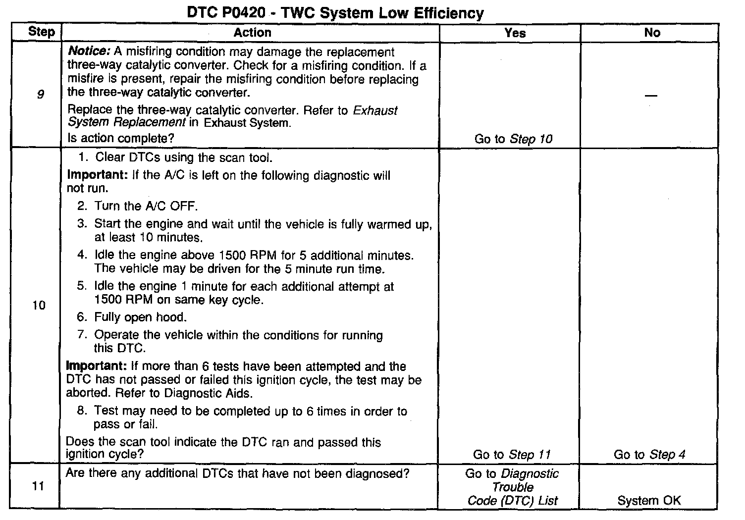 3. Clearing the DTCs allows the catalyst test to be completed up to 18 times and completed up to 6 times this ignition cycle. If the A/C is not turned OFF the diagnostic will not run. The engine must be warmed-up. The converter needs to be warmed-up by raising the engine speed above idle for the specified time prior to each attempted test. Check and see if DTC passed or failed this ignition cycle. If the DTC does not pass or fail look for a possible reason that would cause the test to abort.