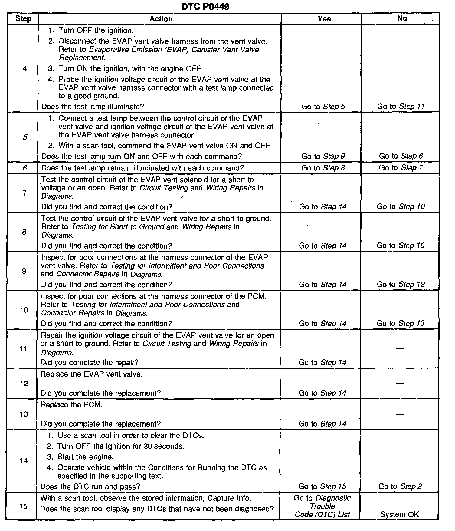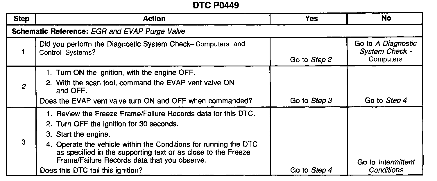 CIRCUIT DESCRIPTIONAn ignition voltage is supplied directly to the Evaporative Emission (EVAP) canister vent valve. The Powertrain Control Module (PCM) controls the EVAP vent valve by grounding the control circuit via an internal switch called a driver. The primary function of the driver is to supply the ground for the controlled component. The PCM monitors the status of the driver. If the PCM detects an incorrect voltage for the commanded state of the driver, DTC P0449 sets