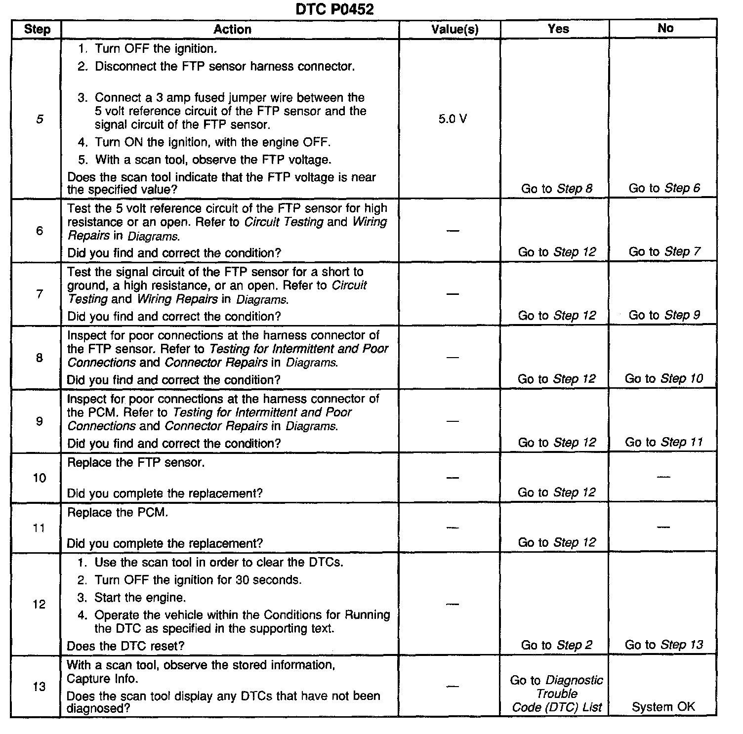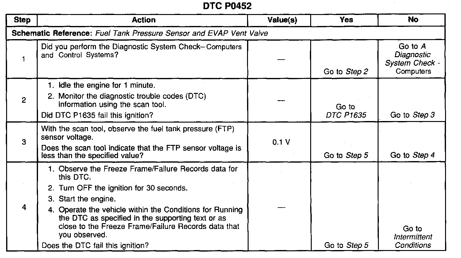 CIRCUIT DESCRIPTIONThe Powertrain Control Module (PCM) monitors the Fuel Tank Pressure (FTP) sensor signal in order to detect vacuum decay and excess vacuum during the enhanced Evaporative Emission (EVAP) diagnostic. The PCM supplies a 5-volt reference and ground to the sensor. The FTP sensor signal voltage increases as the fuel tank pressure decreases (negative pressure or vacuum, high voltage). The FTP sensor signal voltage decreases as the fuel tank pressure increases (positive pressure, low voltage). This DTC sets when the FTP sensor signal goes below a predetermined value.