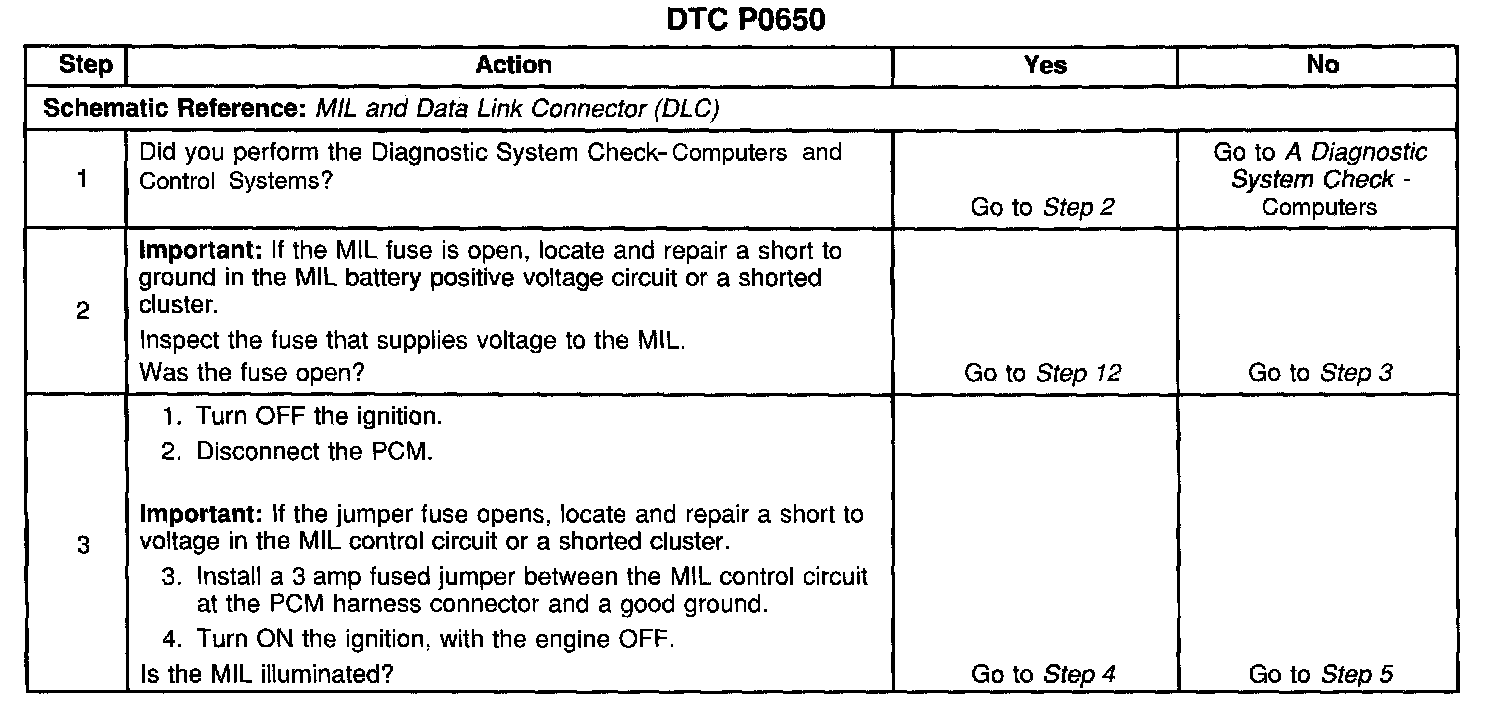 CIRCUIT DESCRIPTIONOutput Driver Modules (ODMS) are used by the Powertrain Control Module (PCM) to turn on many of the current-driven devices that are needed to control various engine and transaxle functions. Each ODM is capable of controlling up to 7 separate outputs by applying ground to the device which the PCM is commanding ON. Unlike the Quad Driver Modules (QDMs) used in prior model years, ODMs have the capability of diagnosing each output circuit individually. DTC P0650 set indicates an improper voltage level on the output circuit that controls the Malfunction Indicator Lamp (MIL).