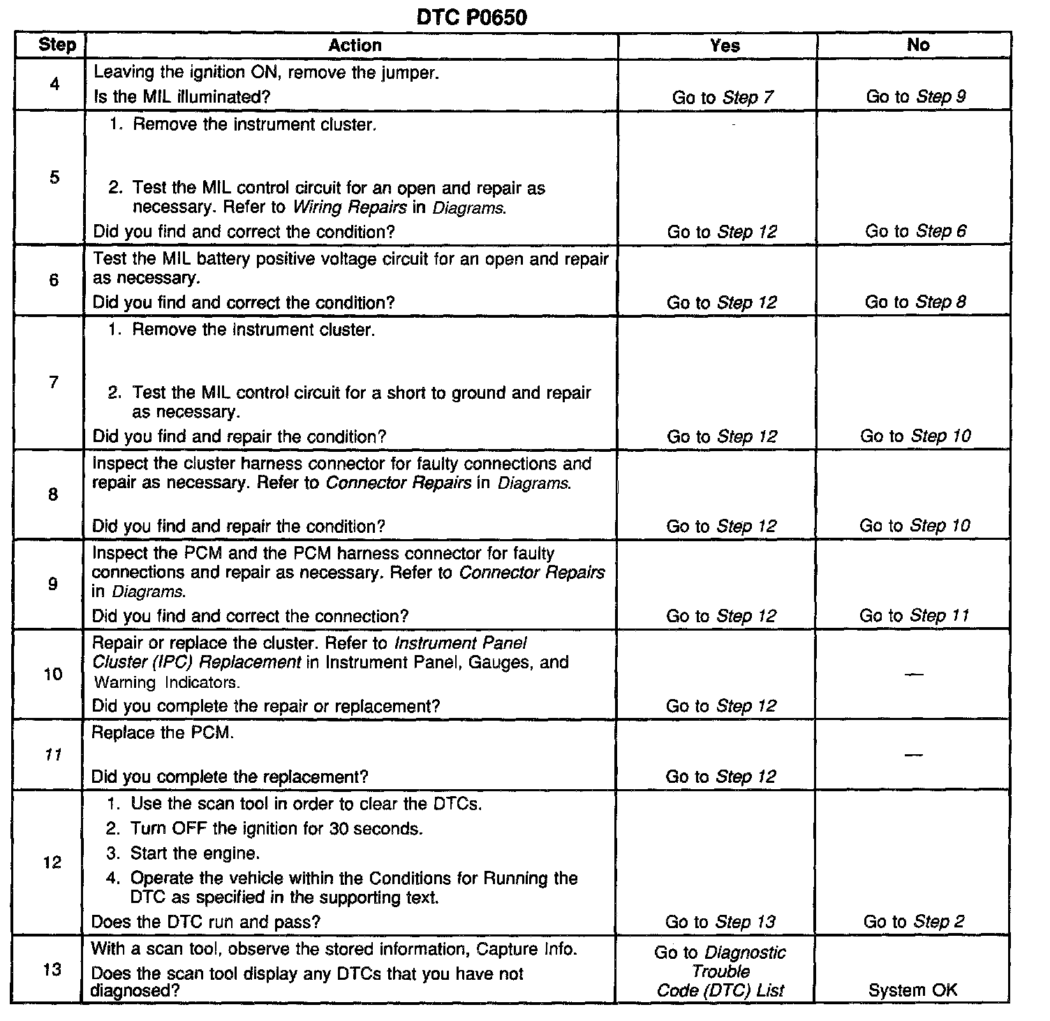 ^ Damaged harness-Inspect the wiring harness for damage. If the harness appears to be OK, disconnect the PCM, turn the ignition ON and observe a digital multimeter connected between the MIL control circuit and ground at the PCM harness connector while moving connectors and wiring harnesses related to the MIL. A change in voltage will indicate the location of the malfunction.