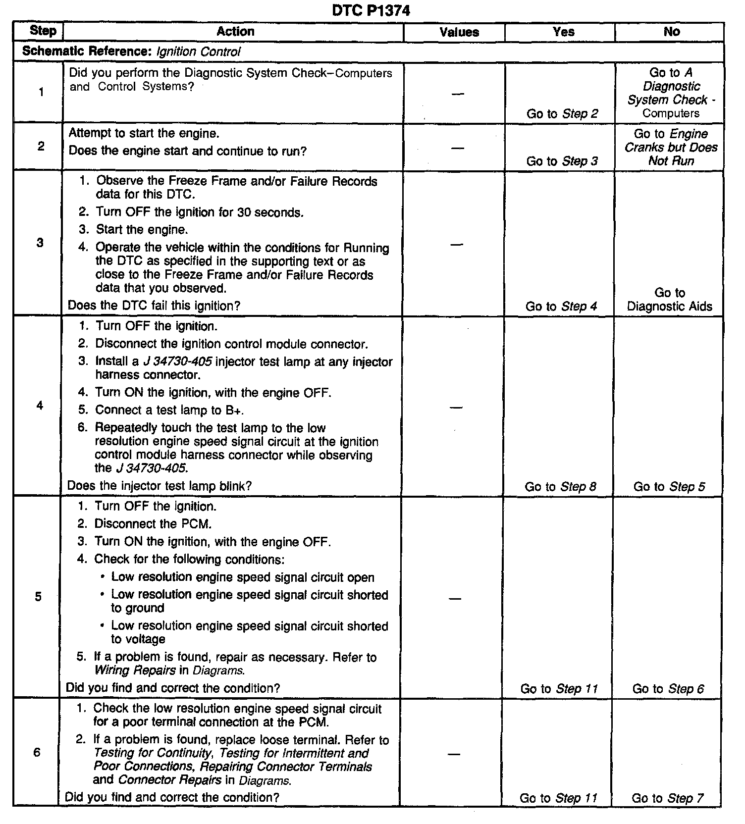 CIRCUIT DESCRIPTIONThe 3X reference signal is produced by the Ignition Control Module (ICM). The ICM calculates the 3X reference signal by dividing the Crankshaft Position (CKP) sensor 18X pulses by 3 when the engine is running and CKP sync pulses are also being received. The Powertrain Control Module (PCM) uses the 3X reference signal to calculate engine RPM and crankshaft position at engine speeds above 1200 RPM. The PCM also uses the pulses on this circuit to initiate injector pulses. The PCM constantly monitors the number of pulses on the 3X reference circuit and compares the number of 3X reference pulses to the number of 18 X reference pulses and CAM signal pulses being received. If the PCM receives an incorrect number of pulses on the 3X reference circuit, DTC P1374 will set and the PCM will use the 18X reference signal circuit for fuel and ignition control. The engine will continue to start and run using the 18X reference and camshaft position PCM input signals only.