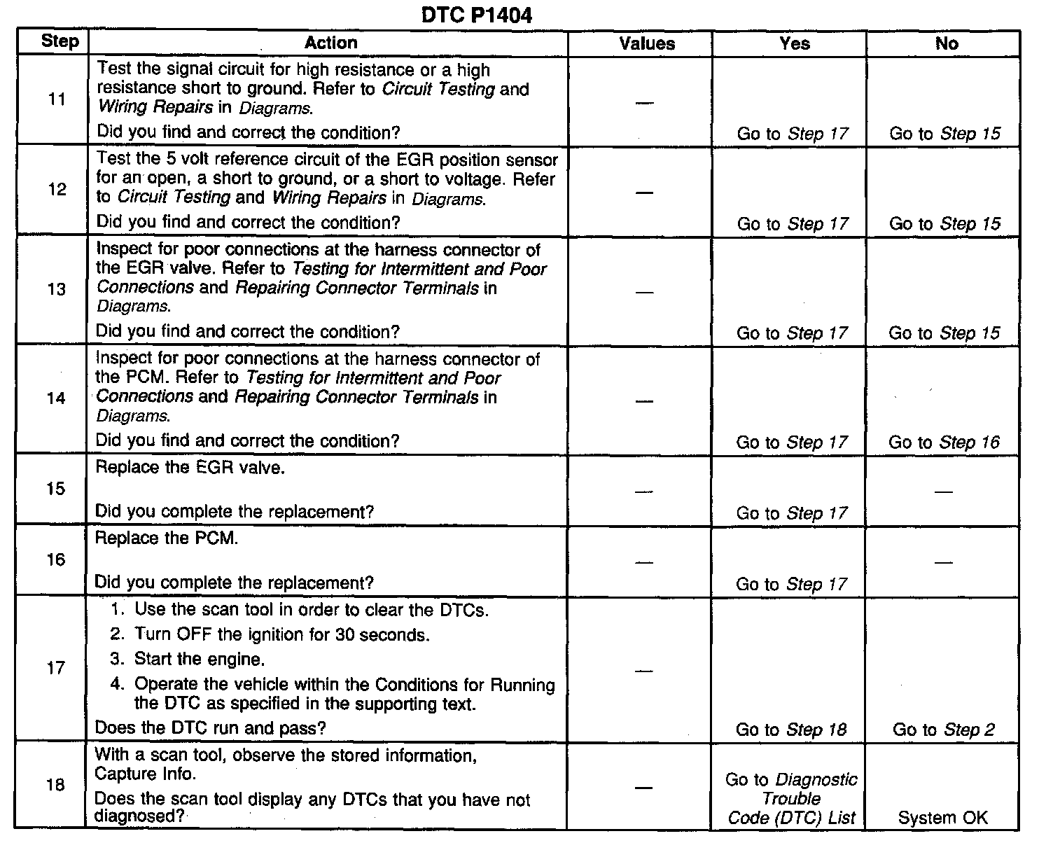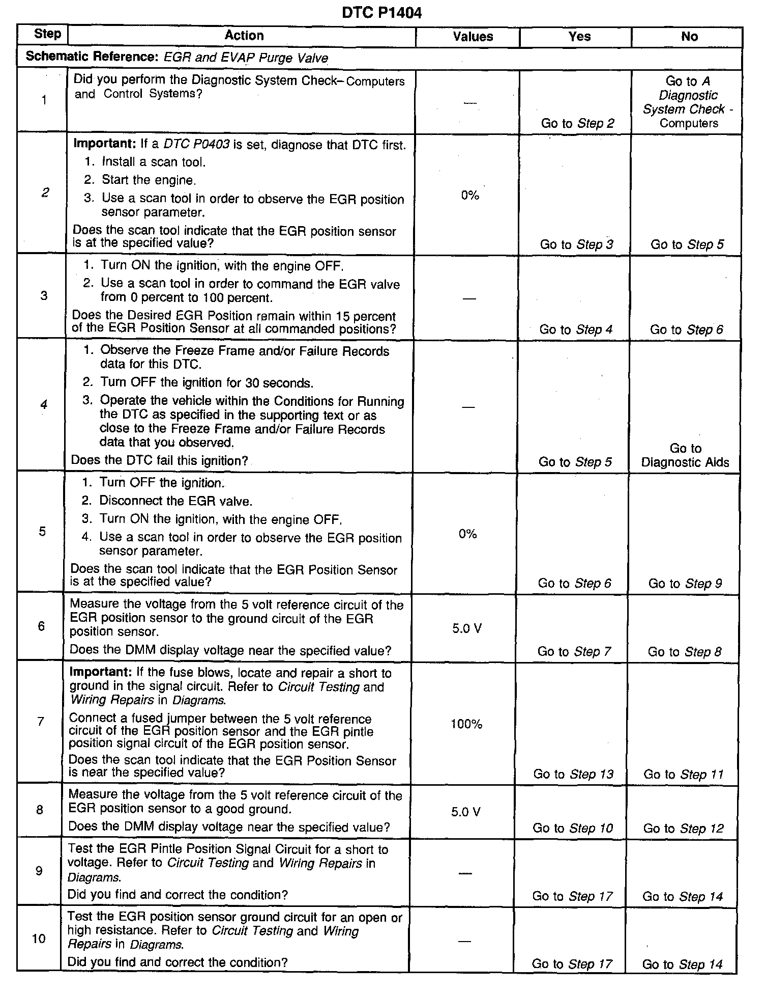 4. If DTC P1404 will only set under certain conditions, the malfunction may be intermittent. Refer to Diagnostic Aids. If an intermittent wiring problem is not present, test for a faulty connection at the PCM or the EGR valve. If the connections are OK and DTC P1404 continues to set, replace the EGR valve.