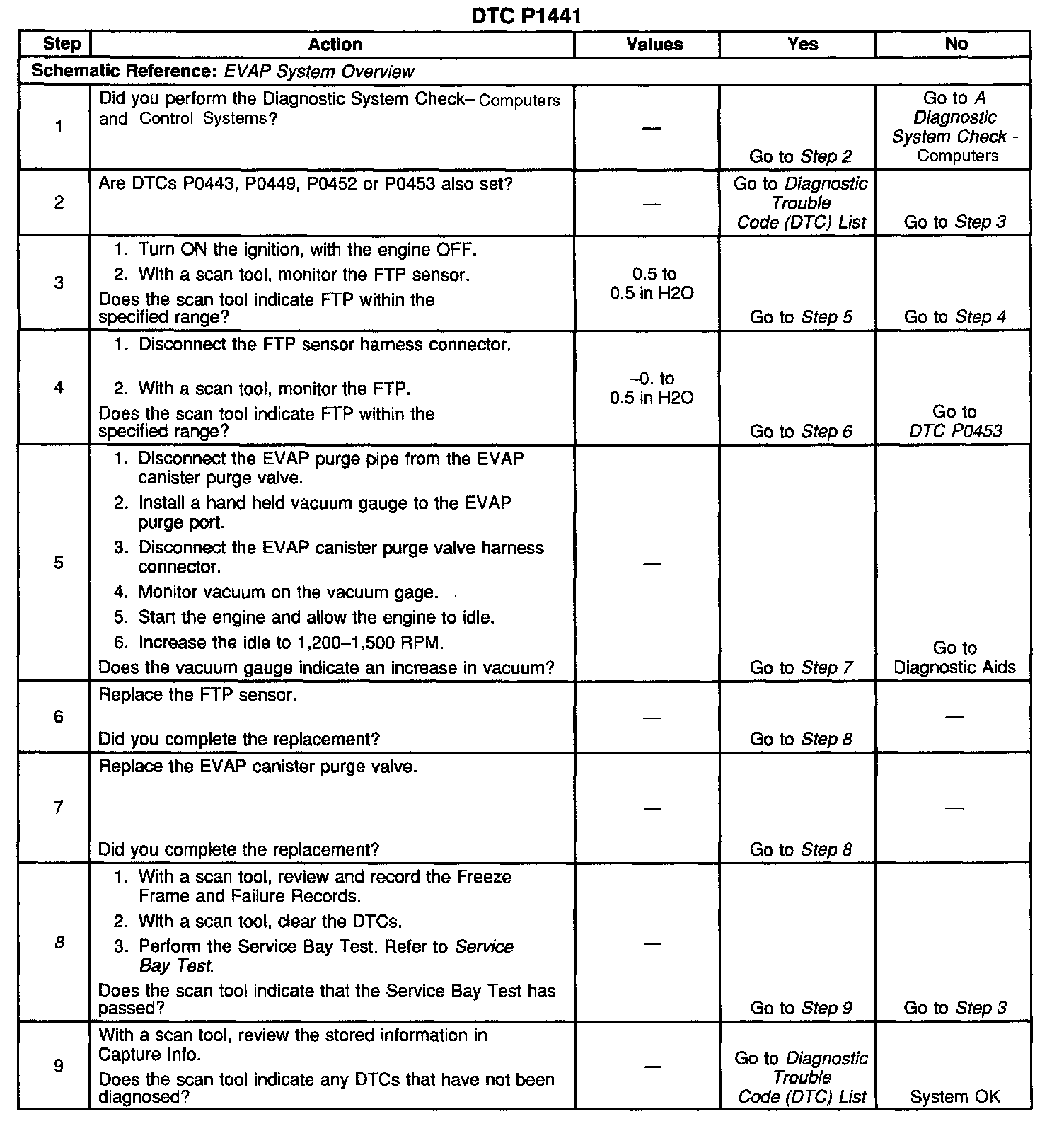 DESCRIPTIONThis DTC tests for undesired intake manifold vacuum flow to the Evaporative Emissions (EVAP) system. The Powertrain Control Module (PCM) seals the EVAP system by commanding the EVAP purge valve OFF, and the EVAP vent valve ON. The PCM monitors the Fuel Tank Pressure (FTP) sensor in order to determine if a vacuum is being drawn on the EVAP system. This DTC will set if the vacuum in the EVAP system is more than a predetermined value within a predetermined time.