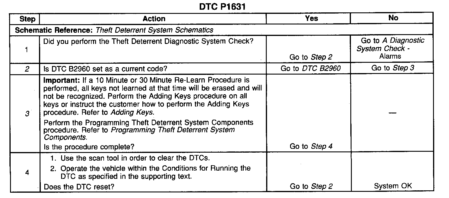CIRCUIT DESCRIPTIONThe theft deterrent controller (VTD) module produces the theft deterrent fuel and starter enable signal when ignition is ON and the proper transponder key value is detected. The powertrain control module (PCM) monitors the fuel and starter enable signal during crank. If the proper signal is present on the Class II Serial Data Circuit, the PCM enables the fuel delivery and starter operation in order to allow the engine to start. If the PCM detects an incorrect password (theft deterrent system failure or attempted vehicle theft, DTC P1631 is set. The engine will not start or crank as long as the condition is present.