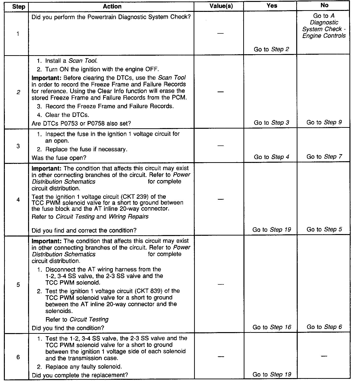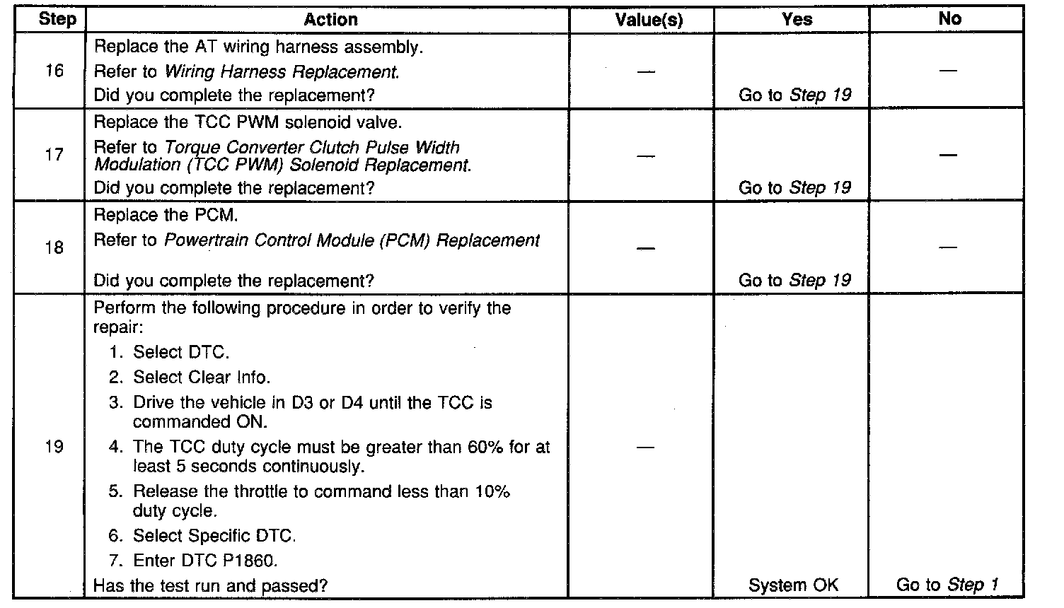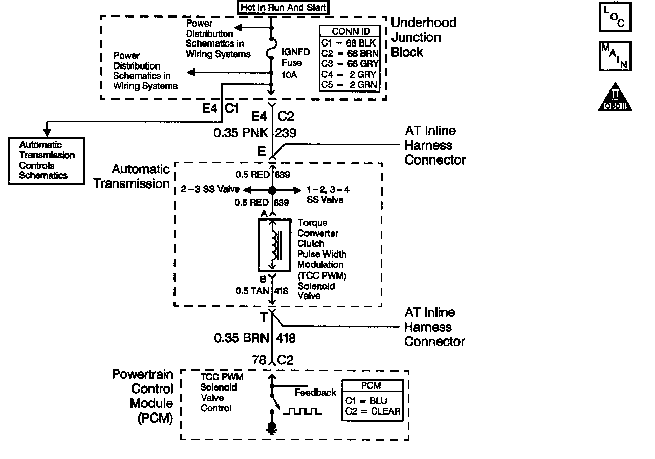 Ignition voltage is provided to the Torque Converter Clutch Pulse Width Modulation (TCC PWM) solenoid valve. The PCM controls the solenoid with a negative duty cycle in order to control application and release of the TCC. When the solenoid is commanded OFF, the PCM senses high voltage. When the solenoid is commanded ON, the PCM senses low voltage.