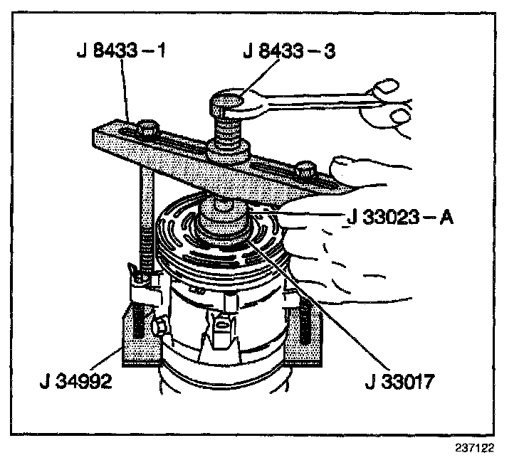 15. Tighten the J 8433-3 in the J 8433-1 in order to force the pulley rotor and bearing assembly onto the front head of the compressor.