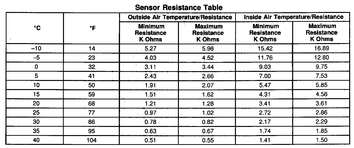Sensor Resistance Table: