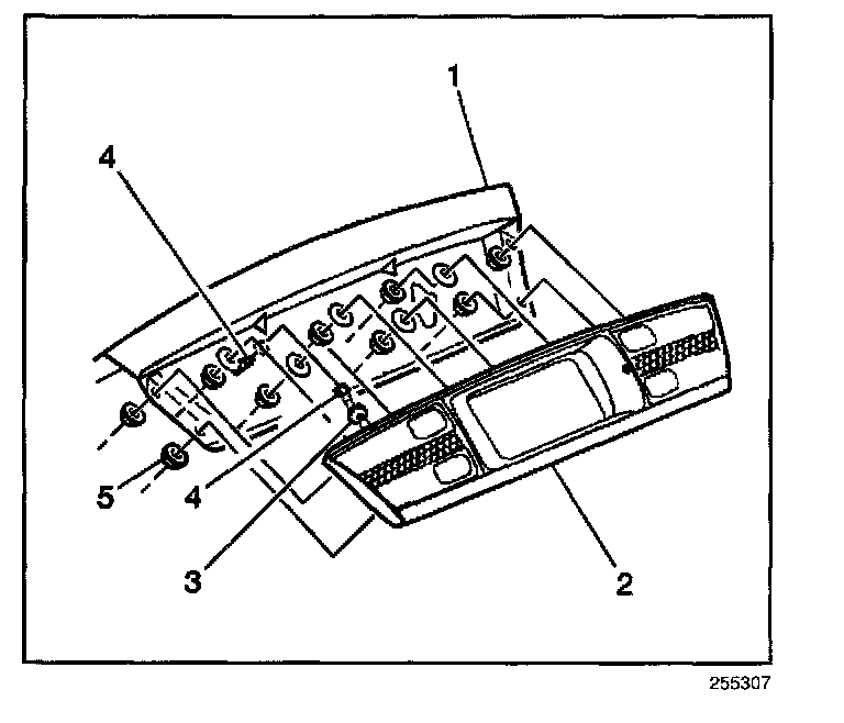 2. Remove the nuts (5) that retain the backup lamp (2) assembly to the rear compartment lid (1).