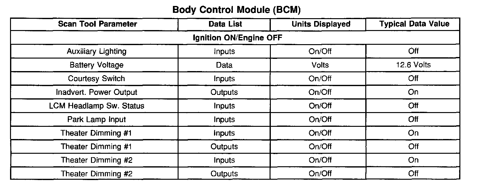 Scan Tool Data List - Body Control Module (BCM)