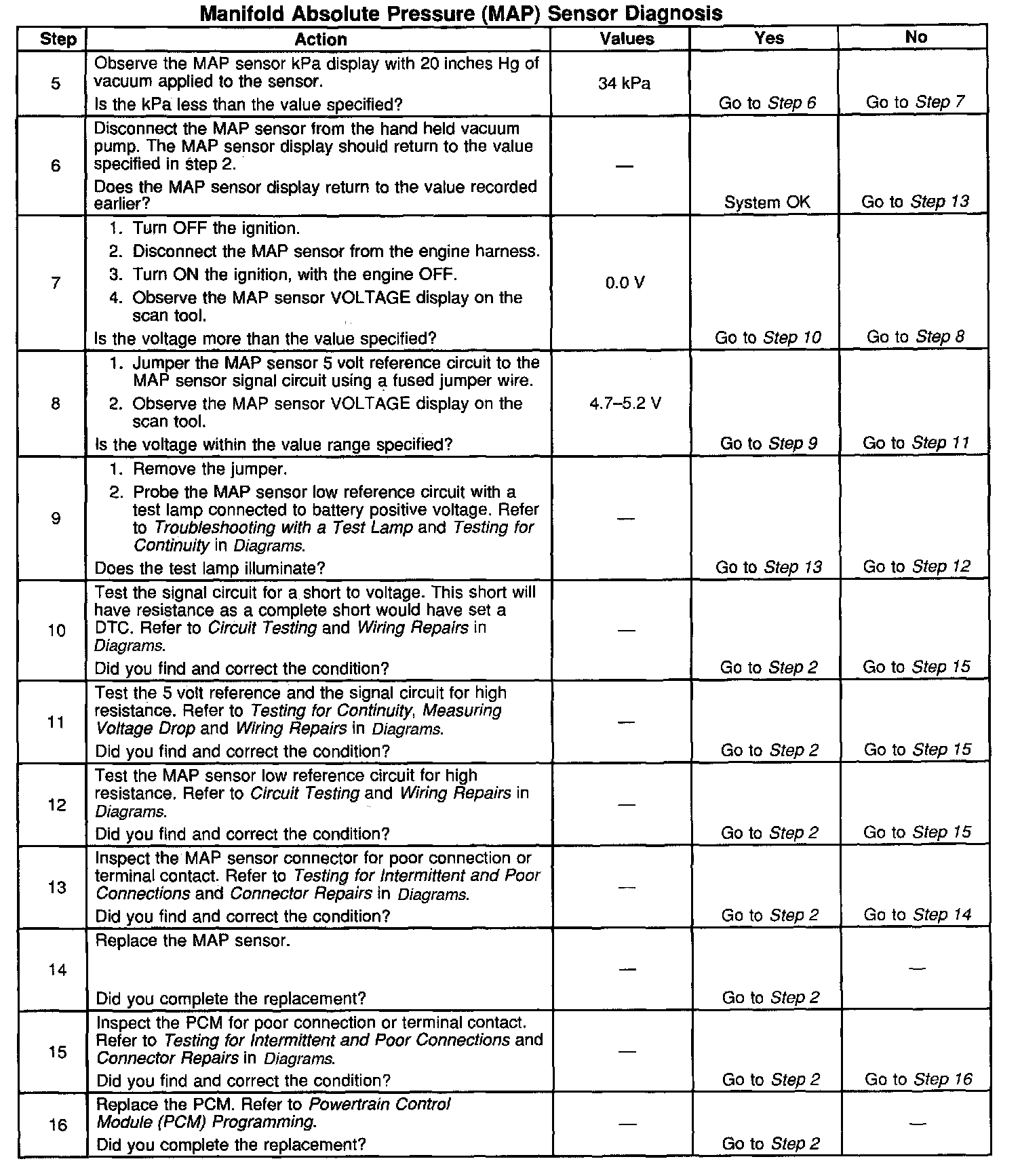 The Manifold Absolute Pressure (MAP) sensor responds to pressure changes in the intake manifold which gives an indication of the engine load. The MAP sensor has a 5-volt reference circuit, a low reference circuit, and a signal circuit. The Powertrain Control Module (PCM) supplies 5-volts to the MAP sensor 5-volt reference circuit and provides a ground on the low reference circuit. The MAP sensor provides a signal to the PCM on the signal circuit which is relative to the pressure changes in the manifold. With low manifold absolute pressure such as during idle or deceleration, the PCM should detect a low signal voltage. With high manifold absolute pressure such as ignition ON, with the engine OFF or wide-open throttle, the PCM should detect a high signal voltage. Certain vehicle models will also use the MAP sensor in order to calculate the Barometric Pressure (BARO) when the ignition switch is turned ON, with the engine OFF. The BARO reading may also be updated whenever the engine is operated at wide-open throttle. The PCM monitors the MAP sensor signal for voltage outside of the normal range. If the PCM detects a MAP sensor signal voltage that is excessively high, DTC P0108 will set. IF the PCM detects a MAP sensor signal voltage that is excessively low, DTC P0107 will set.