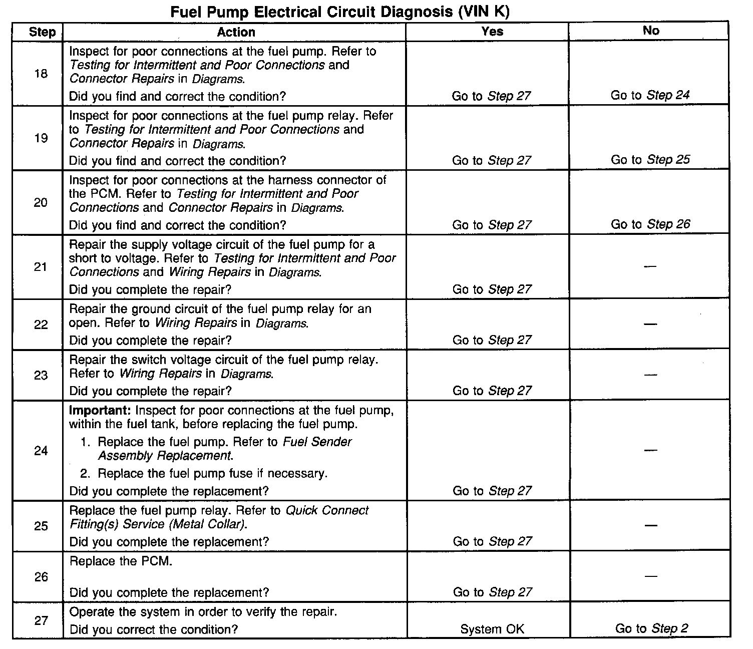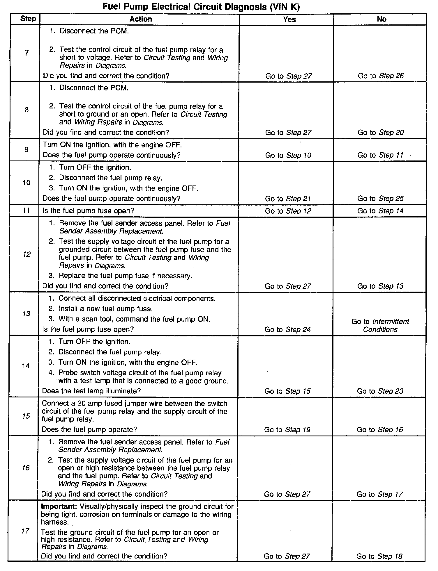 17. This step tests the fuel pump ground circuit for an open or high resistance.