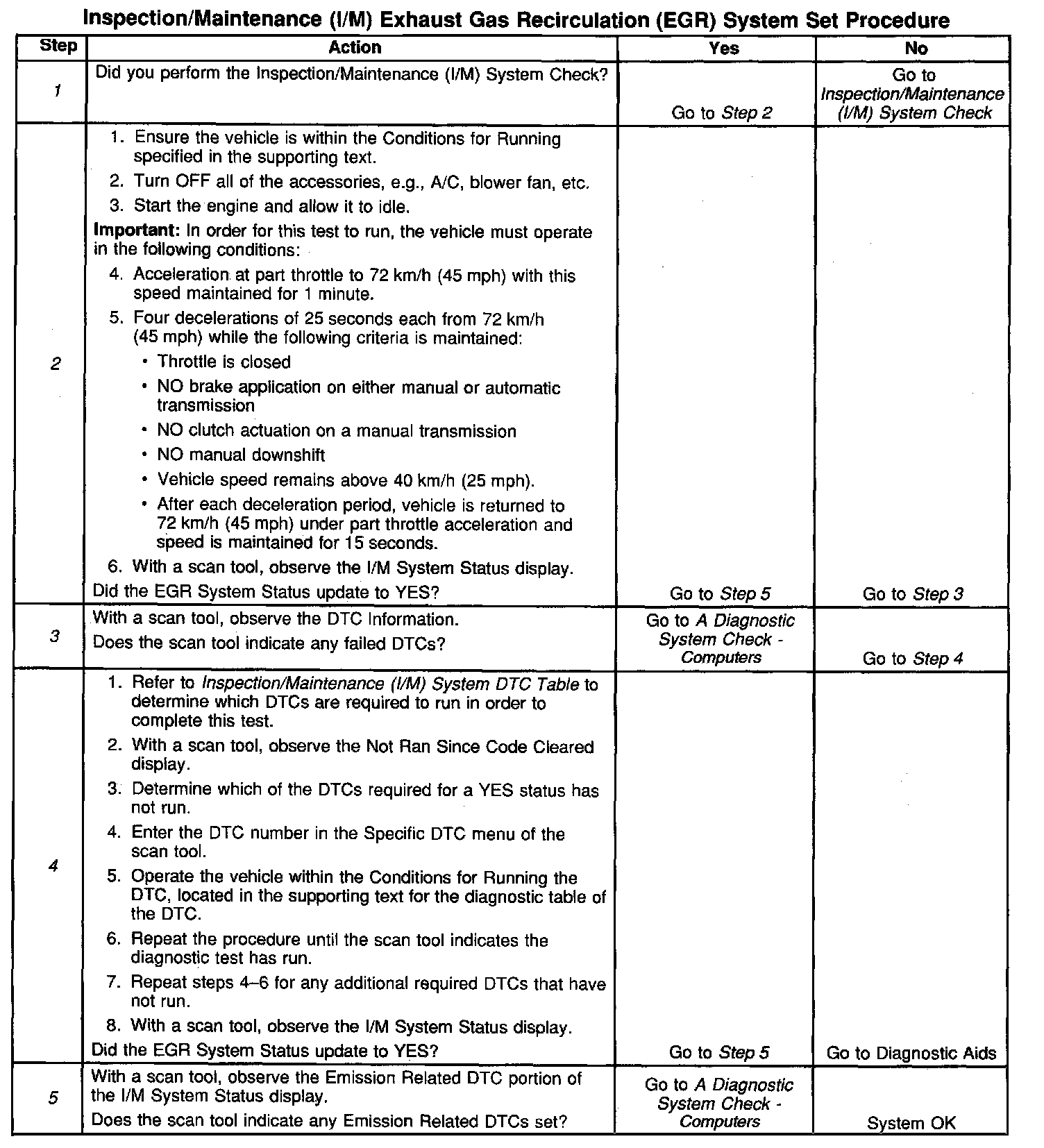 The control module only runs the EGR Active Tests during a gradual deceleration with a closed throttle and a vehicle speed above 40 km/h (25 mph). Several deceleration cycles may be necessary in order to accumulate a sufficient number of EGR flow samples. The procedure outlined in the table is for a clear, flat road. If the procedure is performed on a road with a slight down hill grade, the test may acquire the necessary sample counters in one or two decel trips. If the test is interrupted during the procedure, it may take more than three deceleration cycles to complete the test. If the status does not update, the test outlined in this procedure can be repeated until the I/M System Status updates to YES.